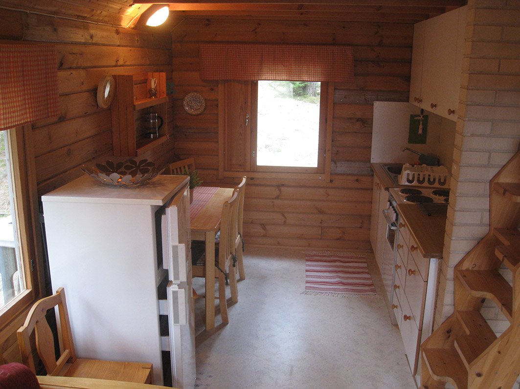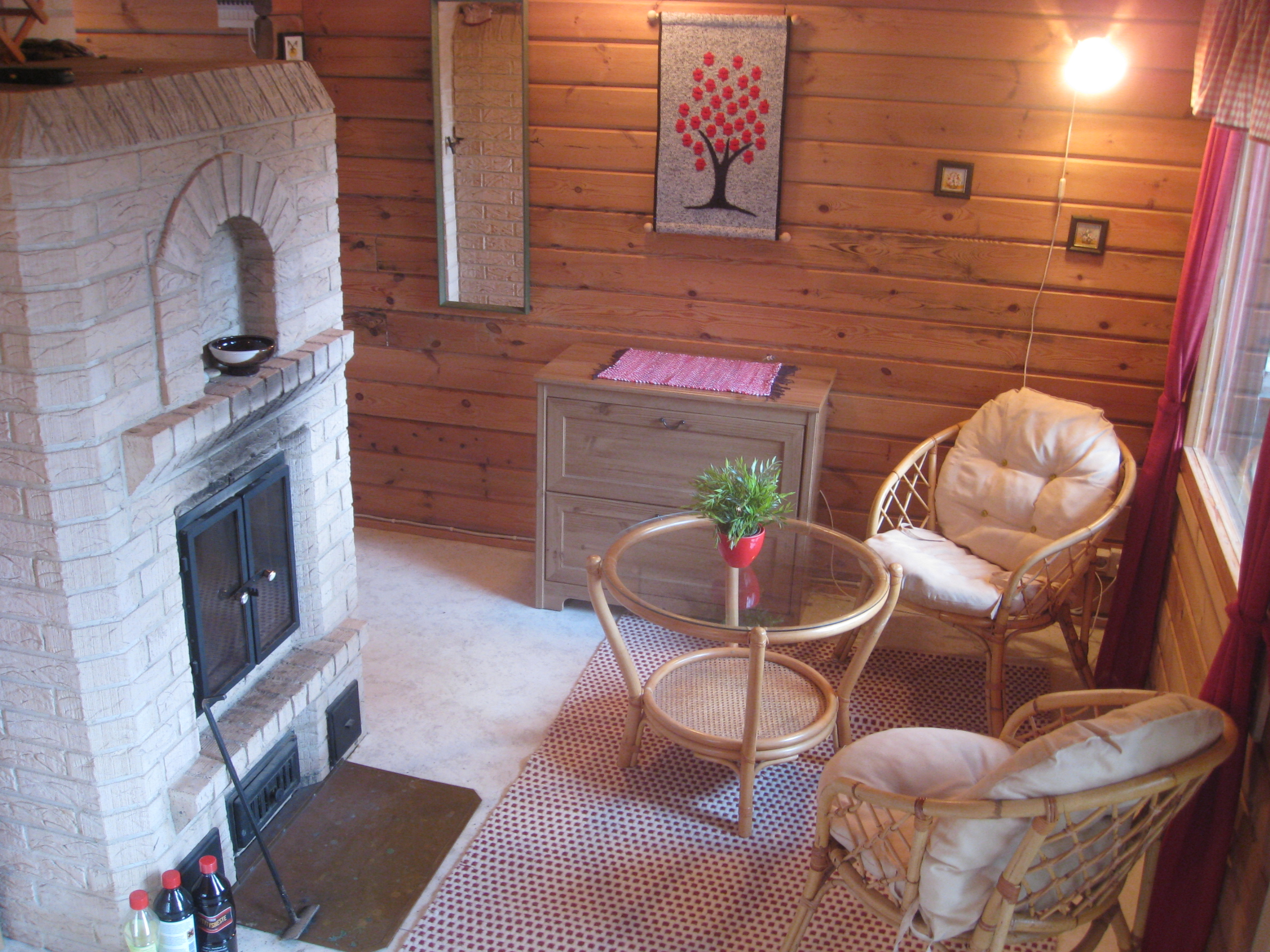 Alakerta, 26m²: erillinen makuuhuone, keittiösyvennys ja olohuone, jossa takka.