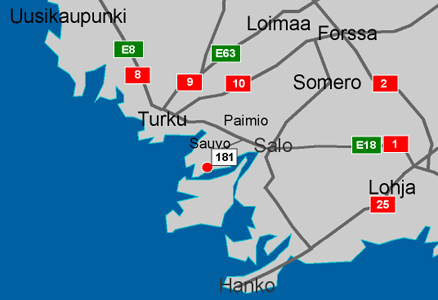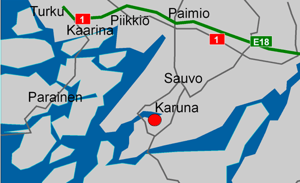 Karunaan pääsee hyviä tieyhteyksiä myöten mukavasti sekä Turusta että Salosta, joihin kumpaankin on vain 45 kilometriä. Lähin kaupunki on Paimio.